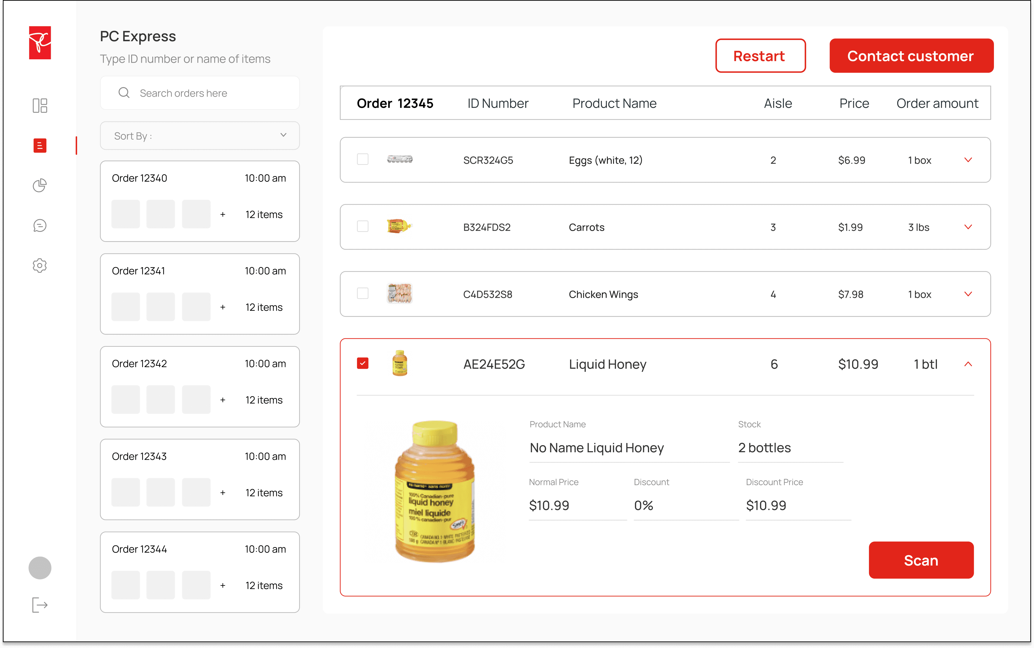 Colleague device: A colleague views their assigned orders for the day on a dashboard. Each order shows the item list and provides a quick way to contact the customer if needed. As they scan each item while picking, inventory updates instantly in the system and reflects in the customer’s app in real time.