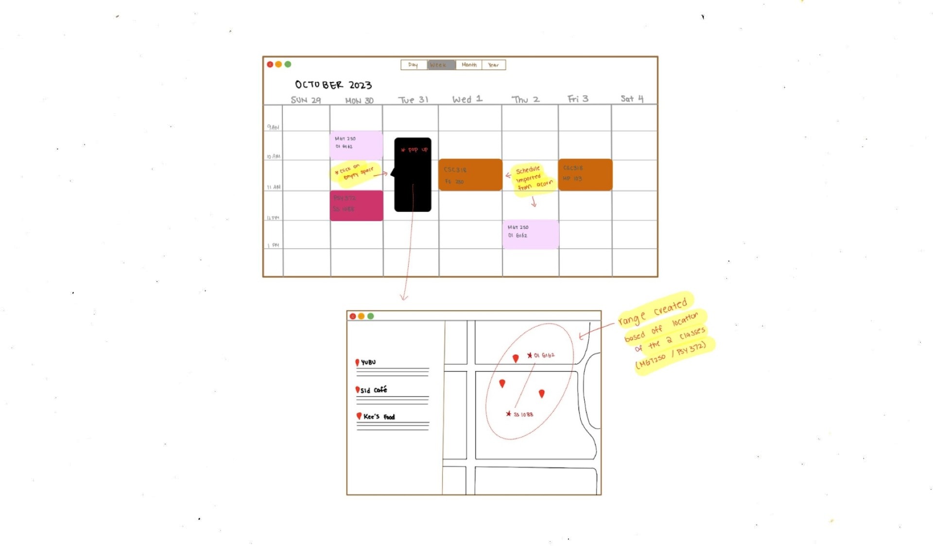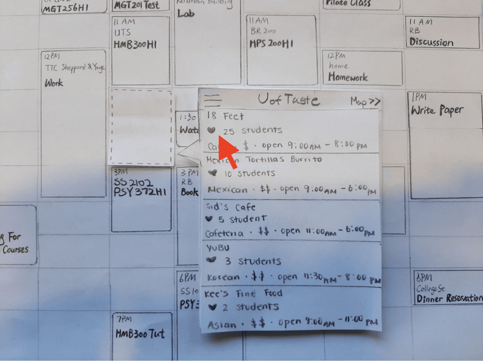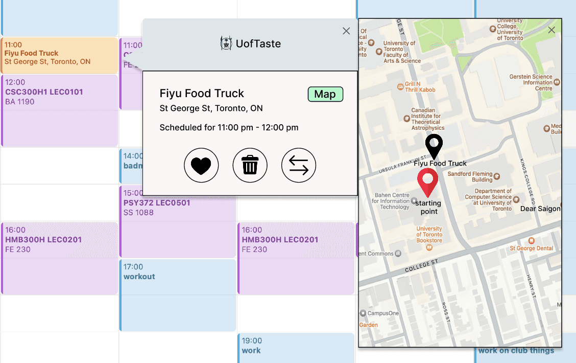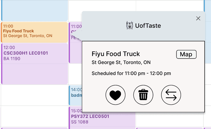 A software that integrates with the user’s UofT timetable to recommend nearby food spots, tailored to fit their schedule and location constraints.