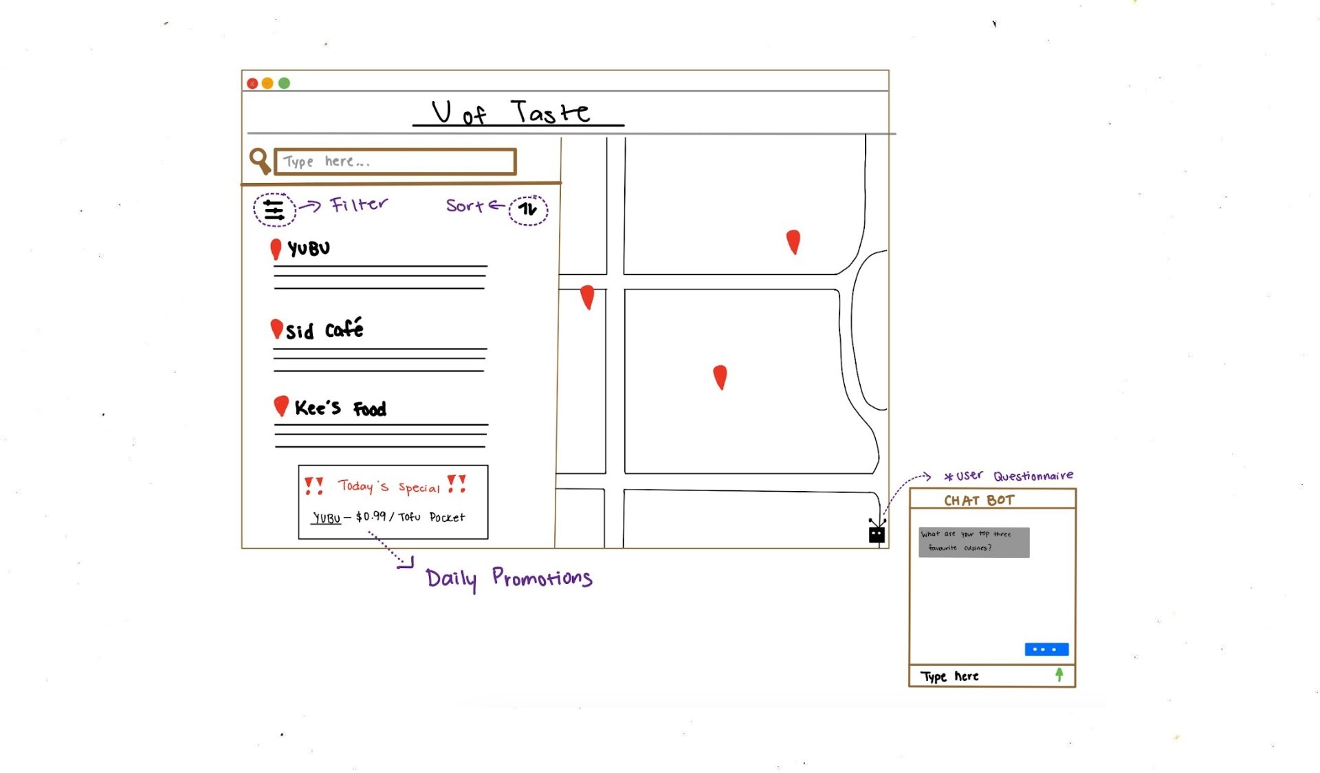 Displays all campus food vendors with a map and filters based on user preferences. Daily vendor promotions will be highlighted, and users can fill out a short questionnaire to refine recommendations. Saved preferences enable quick, personalized access on future visits.
