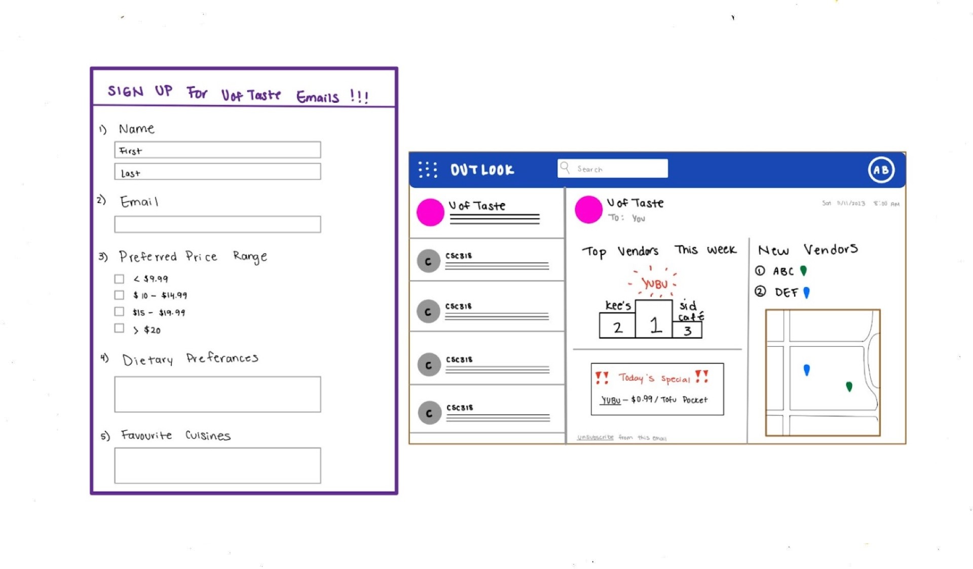 Users can sign up for a subscription service by filling out a form with preferences (e.g., price range, dietary needs, favorite cuisines). After subscribing, they’ll receive weekly emails with personalized vendor recommendations and discounts/promotions from nearby small businesses.